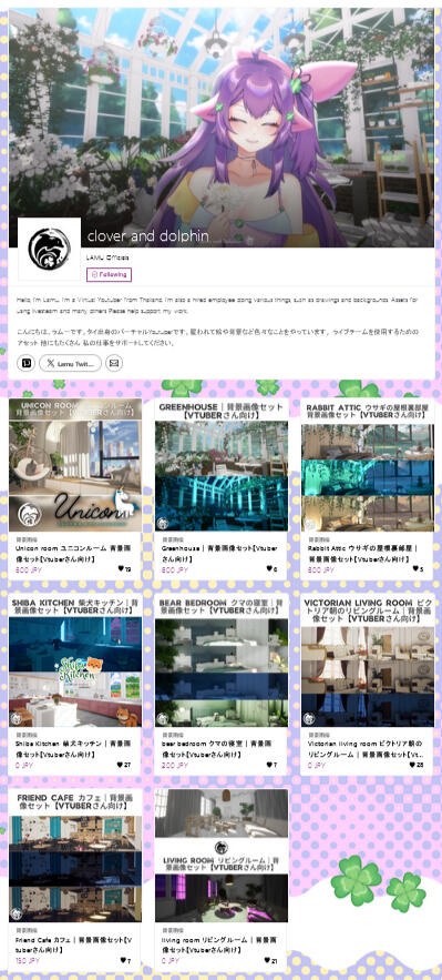 Clover and Dolphin — Digital Goods for VTubers & StreamersClover and Dolphin คือร้านขายสินค้าดิจิตอลที่สร้างสรรค์โดย ลามุดเอง ทุกสินค้าที่จำหน่ายในร้านนี้ล้วนออกแบบและผลิตโดยลามุเอง 100% ด้วยความตั้งใจและใส่ใจในทุกรายละเอียดสินค้าของเราเหมาะสำหรับ VTubers, Streamers และครีเอเตอร์ที่ต้องการเพิ่มเสน่ห์ให้กับคอนเทนต์ของตัวเอง ไม่ว่าจะเป็น…Overlay สำหรับสตรีมอนิเมชั่นเล็ก ๆPNGtuber assetsอีโมจิ / สติ๊กเกอร์น่ารัก ๆวัตถุดิบตกแต่งต่าง ๆ สำหรับใช้บน OBS หรือ Discord🎀 สินค้าทุกชิ้นที่นี่ทำด้วยมือและหัวใจของลามุ หวังว่าจะช่วยเติมสีสันให้กับโลกของคุณได้บ้างนะคะ 💖
